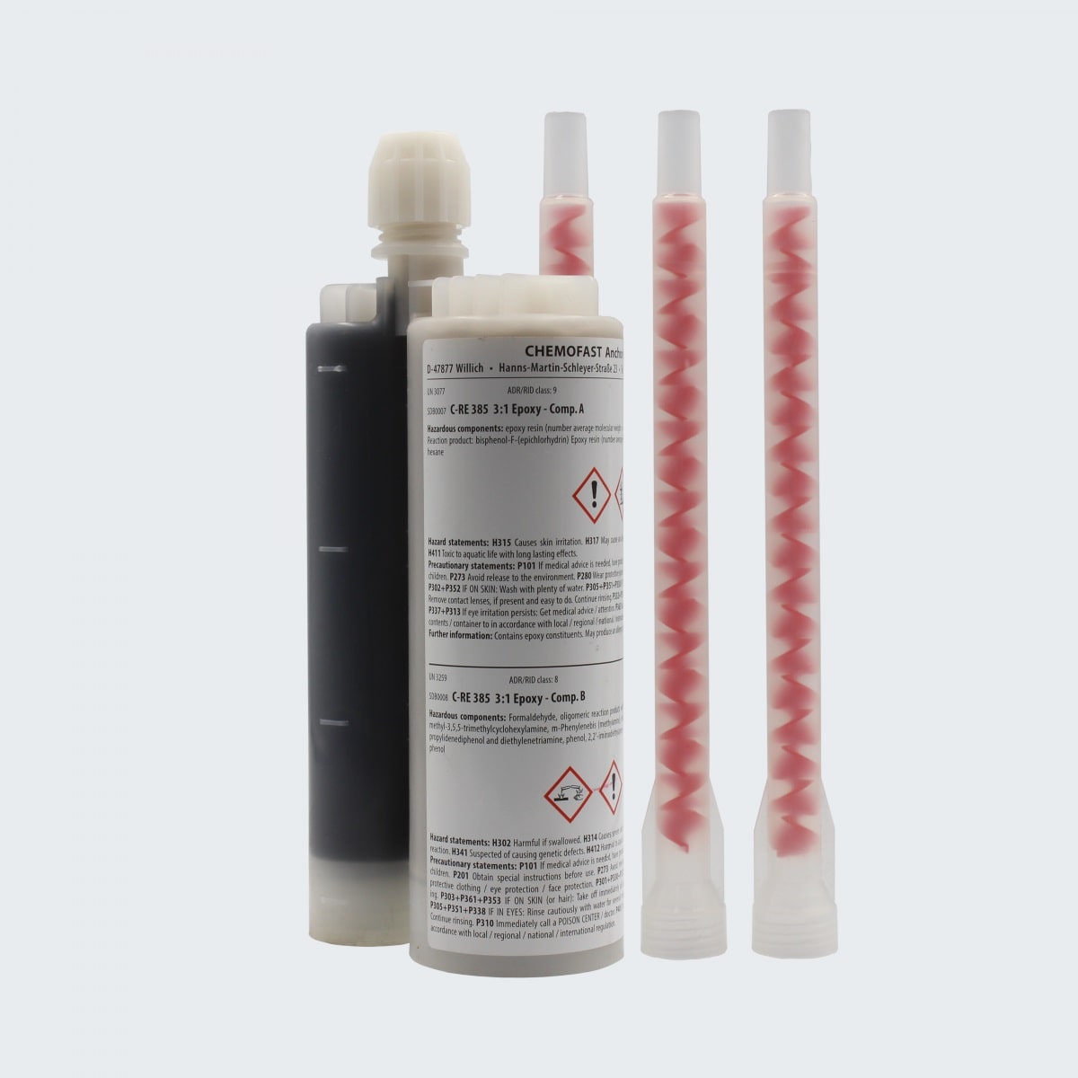C-RE 385 harcı, saf epoksi bazlı 2 bileşenli bir reaksiyon reçine harcıdır ve özel bir 2-C kartuş sisteminde teslim edilecektir. Bu yüksek performanslı ürün, el, pil veya pnömatik alet ve statik karıştırıcı ile birlikte kullanılabilir. Özellikle dişli çubukların, takviye çubuklarının veya içten dişli çubuk manşonların betona (ayrıca gözenekli ve hafif) ve ayrıca sağlam duvarlara sabitlenmesi için tasarlanmıştır. Mükemmel durma davranışına dayalı olarak, içi boş malzemede özel bir plastik manşon ile birlikte kullanılabilirlik sağlanır. C-RE 385 harç ürünü, +5°C'den başlayan kurulum sıcaklığı ve 72°C'ye kadar olan servis sıcaklığı ile çok çeşitli uygulamalarla, ayrıca yüzme havuzları (klor) veya denize yakınlık (tuz) gibi zorlu ortamlardaki uygulamalar için yüksek kimyasal dirençle, çok çeşitli sertifikalar, ulusal ve uluslararası onaylarla ve neredeyse her uygulamaya izin vermesiyle bilinir.